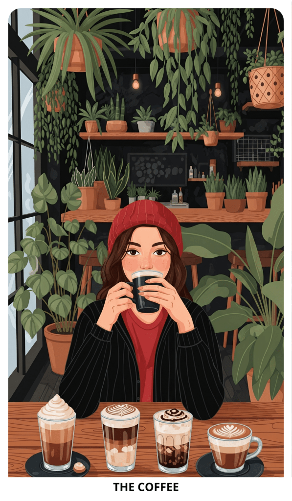 Deck bertema Coffee Shop ini berpatok pada pakem Tarot RWS, dibuat dengan lebih sederhana dan tentunya fokus pada kopi, dan suasana tempat kopi yang penuh dengan tanaman hias tropis.