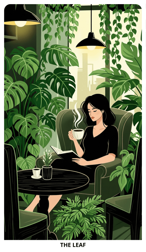 The Leaf adalah kartu yang tenang, fokus pada diri sendiri, melepaskan keraguan dalam diri, menikmati momen dengan napas yang lega. Kopi hangat yang diminum memberikan kedamaian dan fokusnya sendiri. Membuat diri menjadi lebih menikmati, saat memahami tentang segala apapun yang ada di dalam diri. Tanpa takut kekurangan, takut sumber daya habis, dan tidak memiliki apa-apa. Energinya penuh dengan penerimaan, keberlimpahan, pemahaman. Feminin energi yang matang dan paham akan kualitas diri. Tidak bergantung pada siapapun karena apapun yang diinginkan, ada dalam genggamannya.